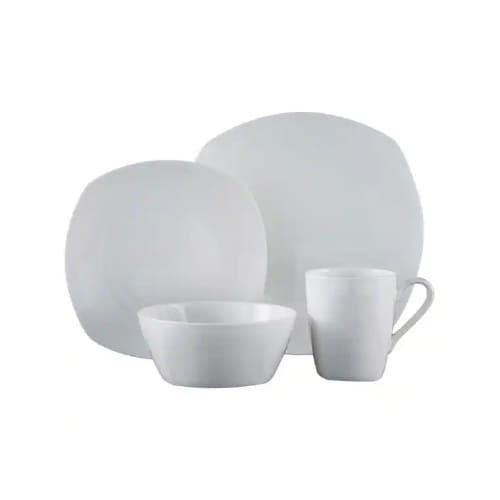 This comprehensive set includes dinner plates, side plates, bowls, and mugs, all crafted from durable bone china with a soft square shape, perfect for modern dining needs.